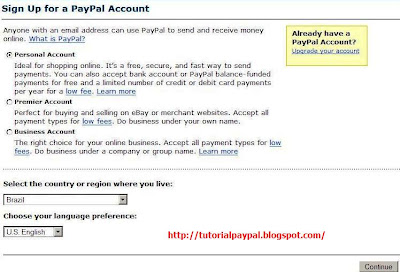 O terceiro passo consiste em selecionar a conta desejada (veja screen abaixo). Como falei no passo anterior selecione "Personal Account" (depois, se desejar pode optar pelas outras duas modalidades - "Premier Account" e "Business Account". Em seguida, selecione o pais onde vive e a linguagem mais adequada. Clique no botão "continue", para continuar.